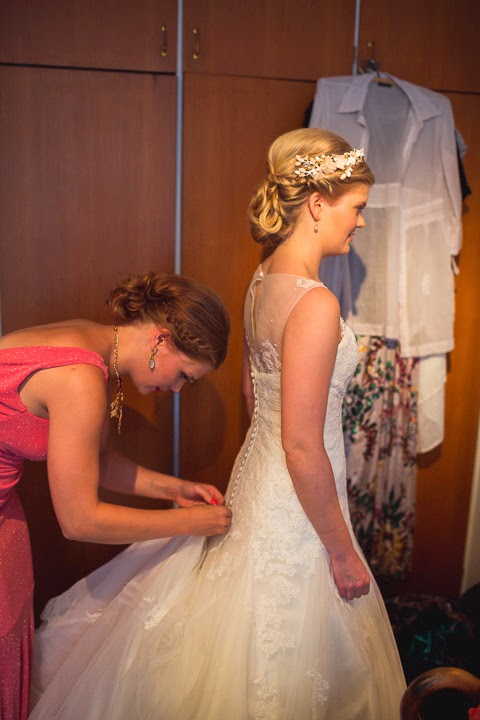 Lähes kaikki hääkoristeet, jotka meillä on, ovat itse tehtyjä: viirit, kukat, kultaiset eläimet, puukoju, valokuvaseinä, vihkipaikan nauhaseinä ja tuulihyrrät. Lisäksi ompelin meidän kukkaistytön mekon ja oman sukkanauhani. Olihan se aikamoista DIY-seikkailua, mutta myös antoisaa ja huokeaakin. Rahaa ei nimittäin ollut ihan kauheasti tuhlattavaksi. Hommasin kaikenlaista pikkutavaraa käytettynä. Vintagena ostin esimerkiksi Jannen solmioneulan käsirenkaani ja käsilaukkuni. En tosin vain hinnan vuoksi, vaan myös saadakseni uniikkeja asusteita. Lisäksi teetimme tai ostimme käsityönä hiuskoristeeni, Jannen kalvosinnapit ja solmiopidikkeen, joka oli bestmanilla lainassa. Morsiusneitojen puvut ostettiin asos.comin alennuksesta, ja pienensin sekä lyhensin ne itse. Edellisenä iltana. Se oli hieman...viimetipassa, mutta onnistui kuitenkin. Säästimme myös esimerkiksi siinä, että täytimme kaikki ilmapallot itse, ja autokuski sekä auto löytyivät perheen piiristä. Rahallisesti panostimme ruokaan, hiuskoruuni, minun pukuuni, hotelliin, DJ:in valokuvaajiin ja kampaajaan. Varsinaista budjettia emme tehneet missään vaiheessa. Yritin käytännössä säästää niin paljon kuin mahdollista ja panostaa tiettyihin juttuihin muita enemmän. Tämä tarkoitti asioita, joita emme osaisi tai joita ei olisi järkevää tehdä itse. Ohjelmakin oli omasta takaa. Vanhempien osallistuminen kustannuksiin oli kuitenkin erittäin olennaista. Suuret kiitokset kuuluvat heille.